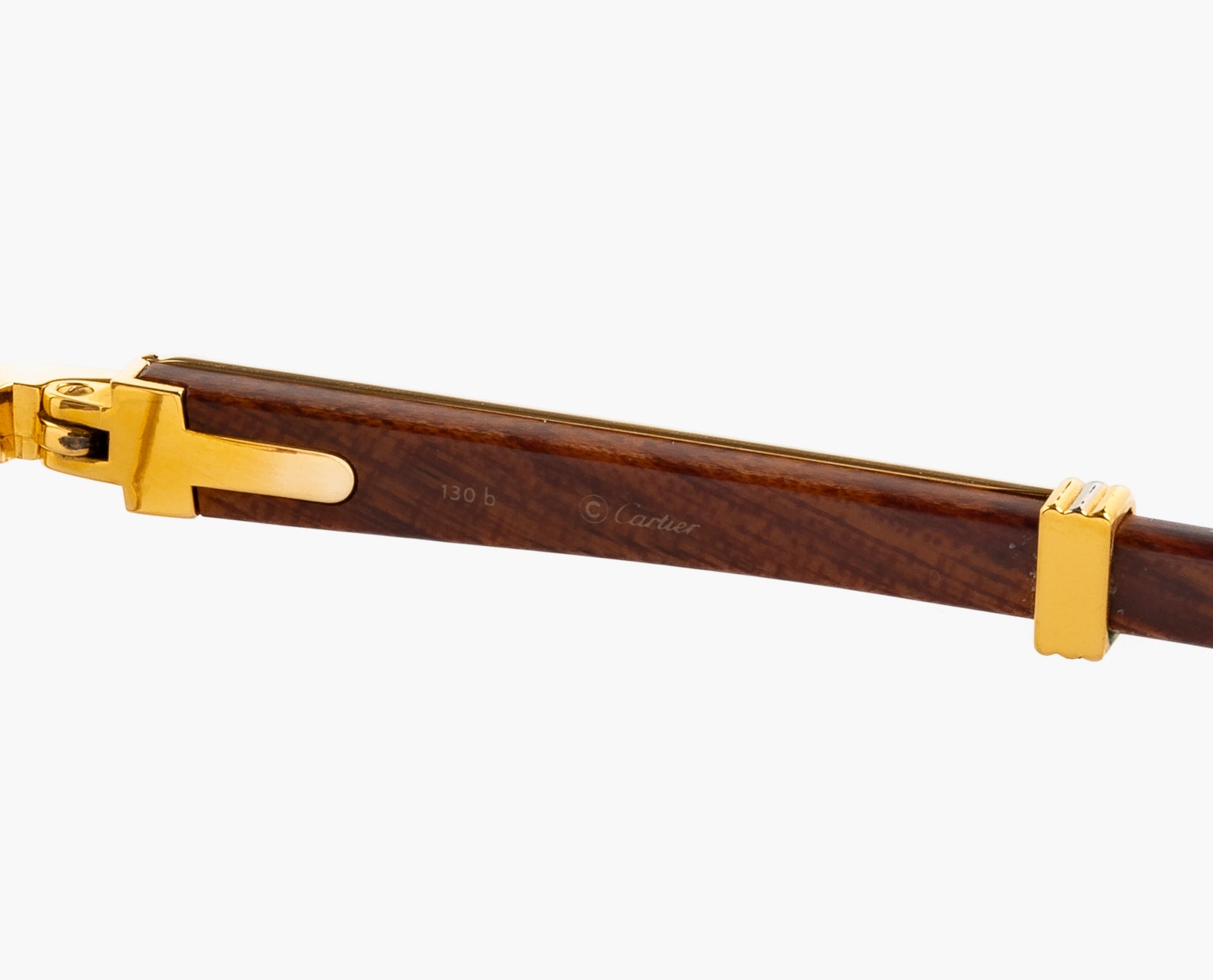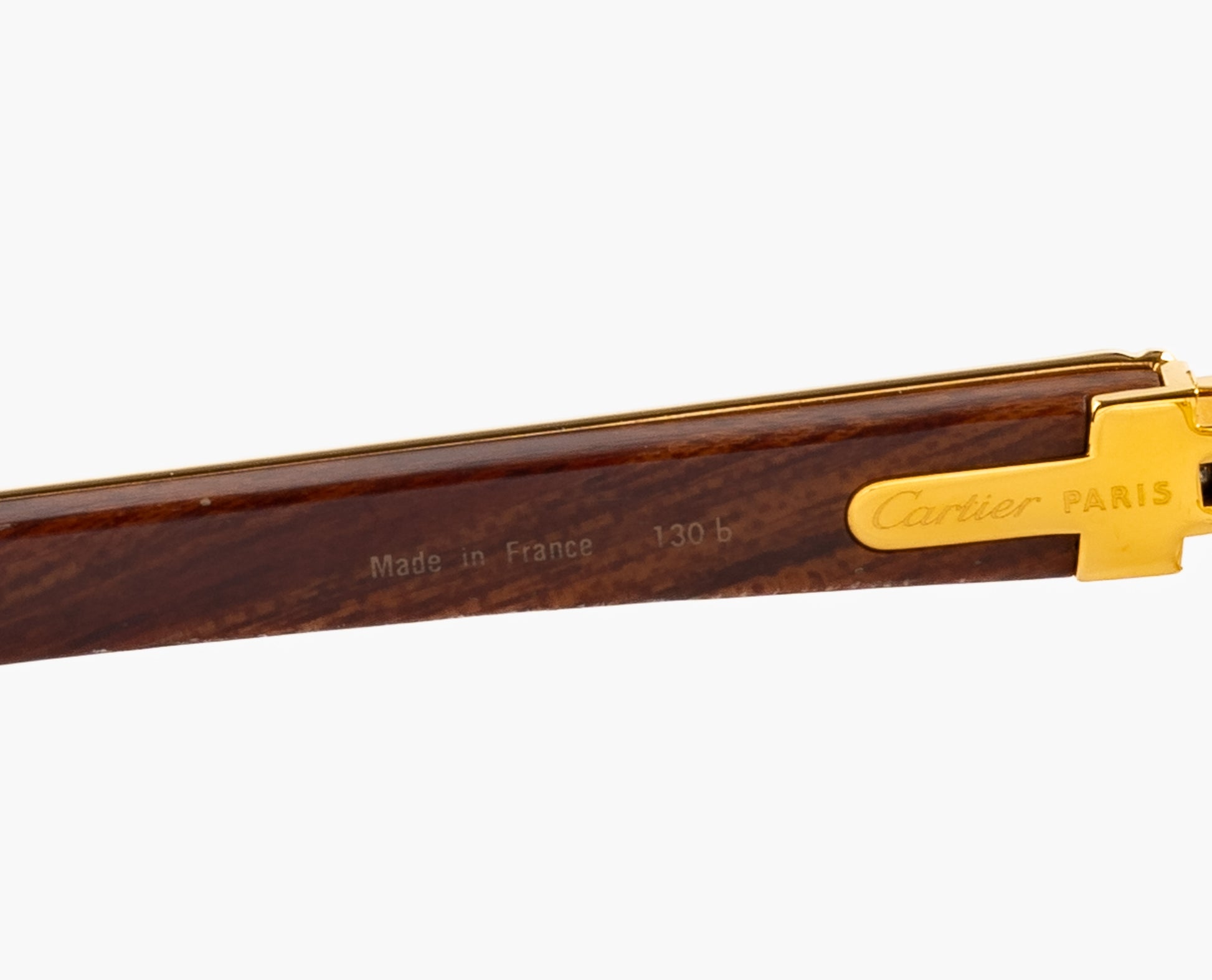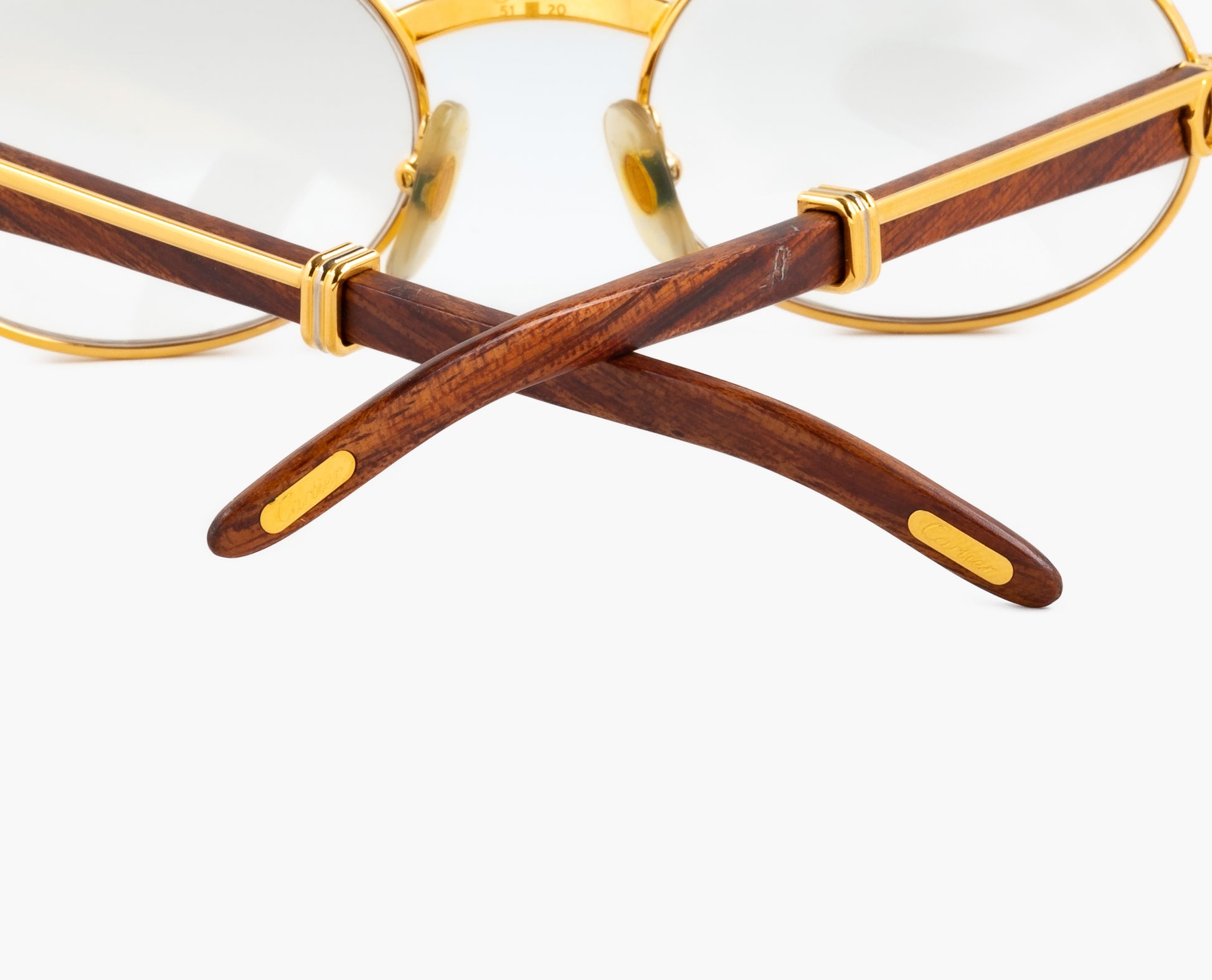 Cartier Giverny is the most popular wooden pair of frames of the 90s. Handmade with precious African 'Bubinga' wood and 22k gold plated metal hardware. Beautiful oval shape. A lot of hiphop artists wore those including Kanye, JayZ, Harry O, Big Boi. But also other celebrities like Maradona.