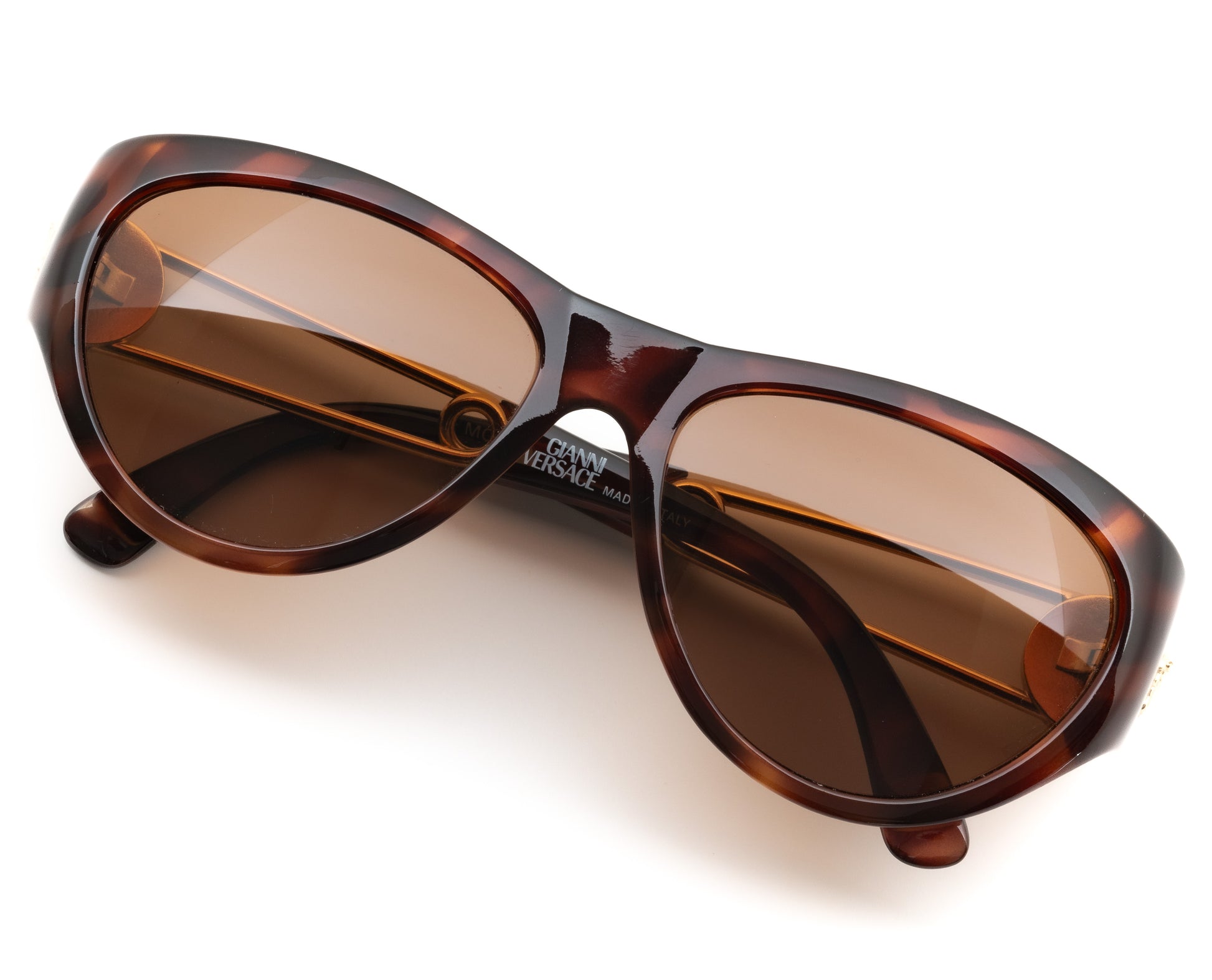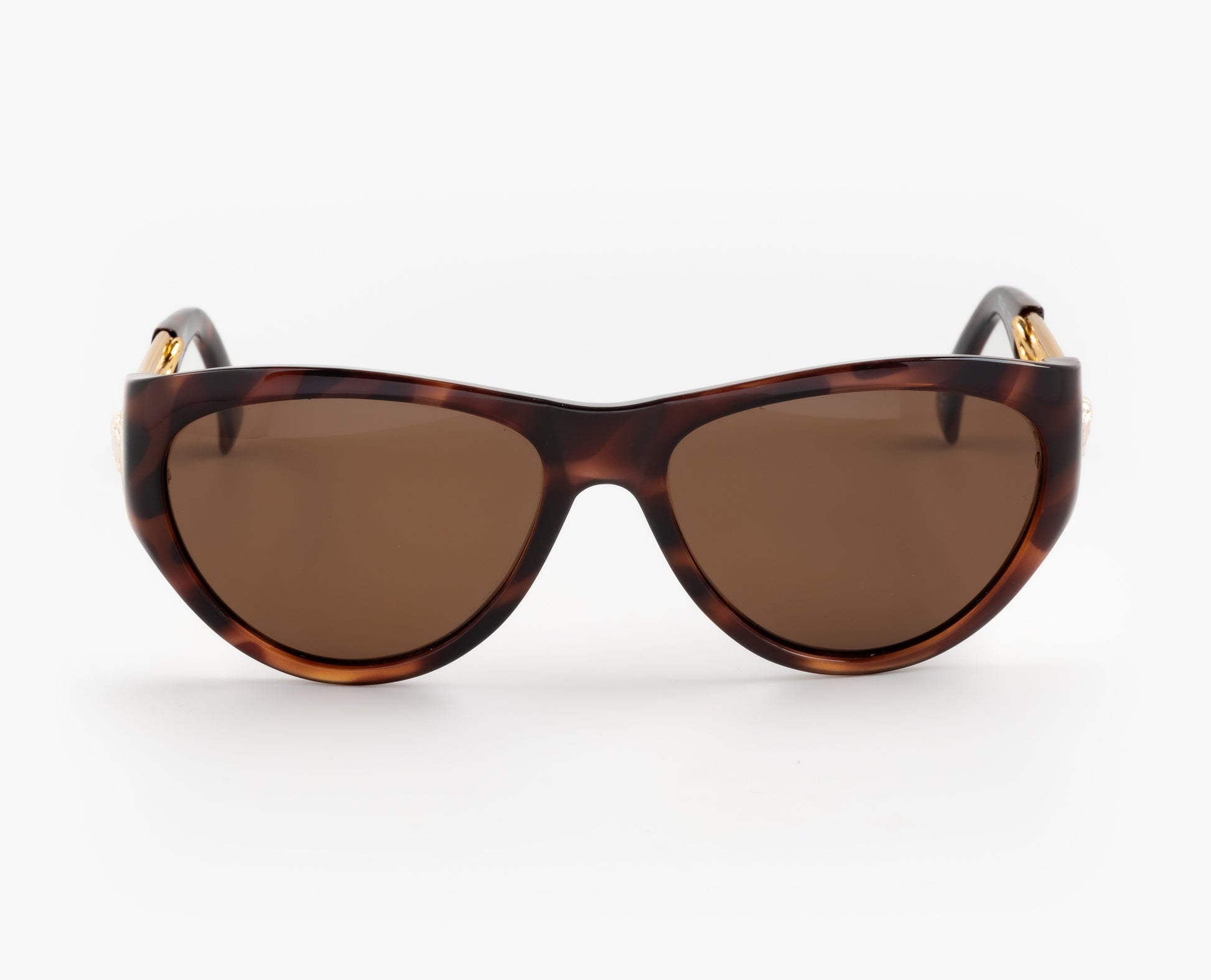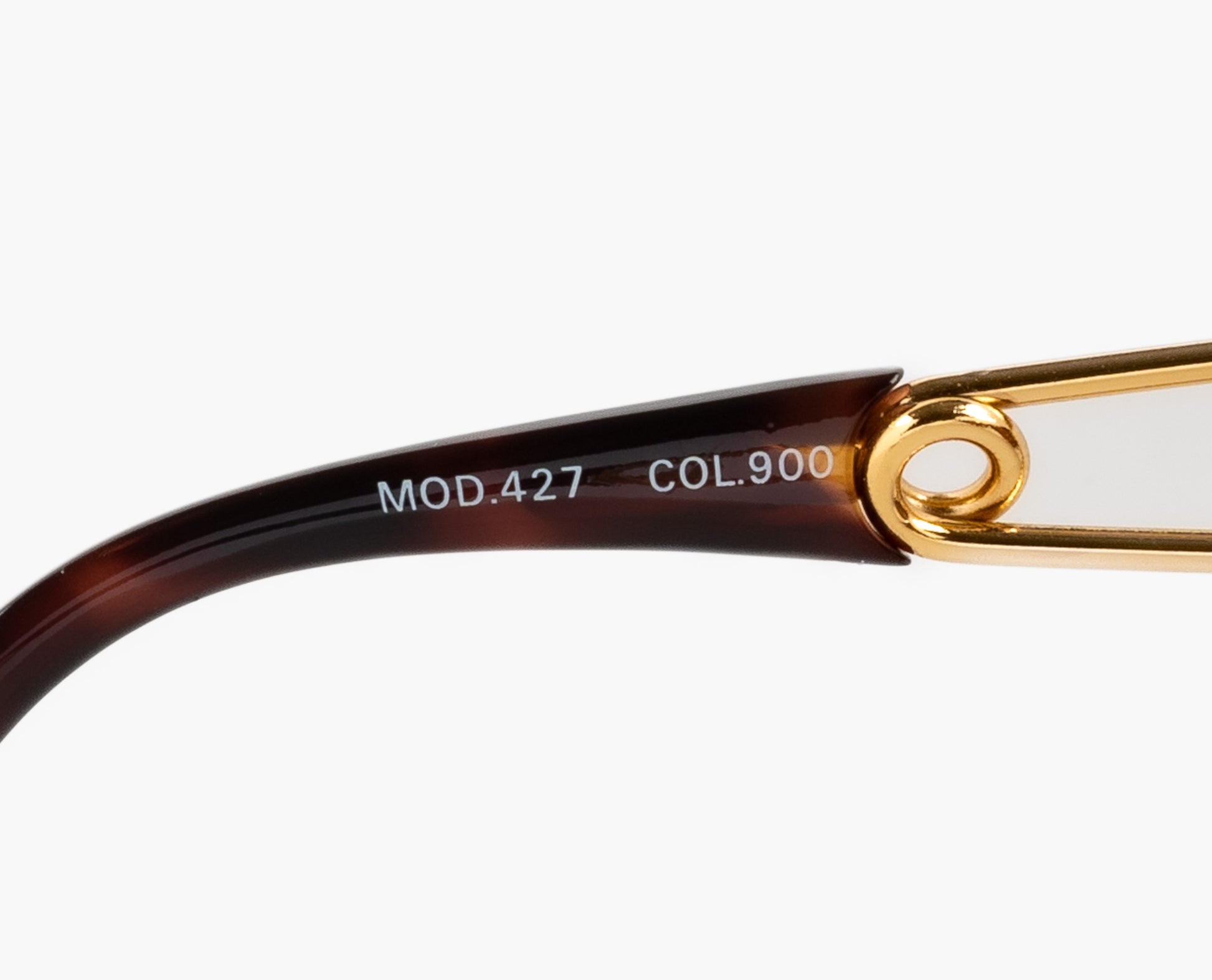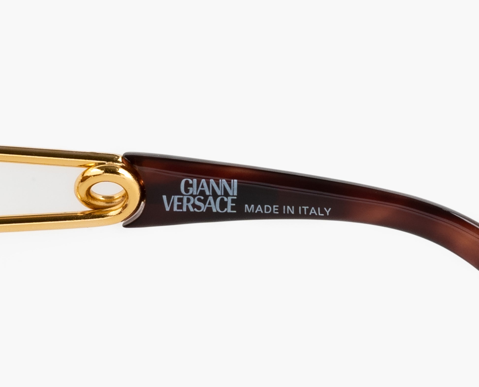 1990s Gianni Versace sunglasses are so on point with 90s hiphop. This is a cool simple dark tortoise front frame with temples in plated gold metal shaped as a safety pin having the iconic medusa logo.