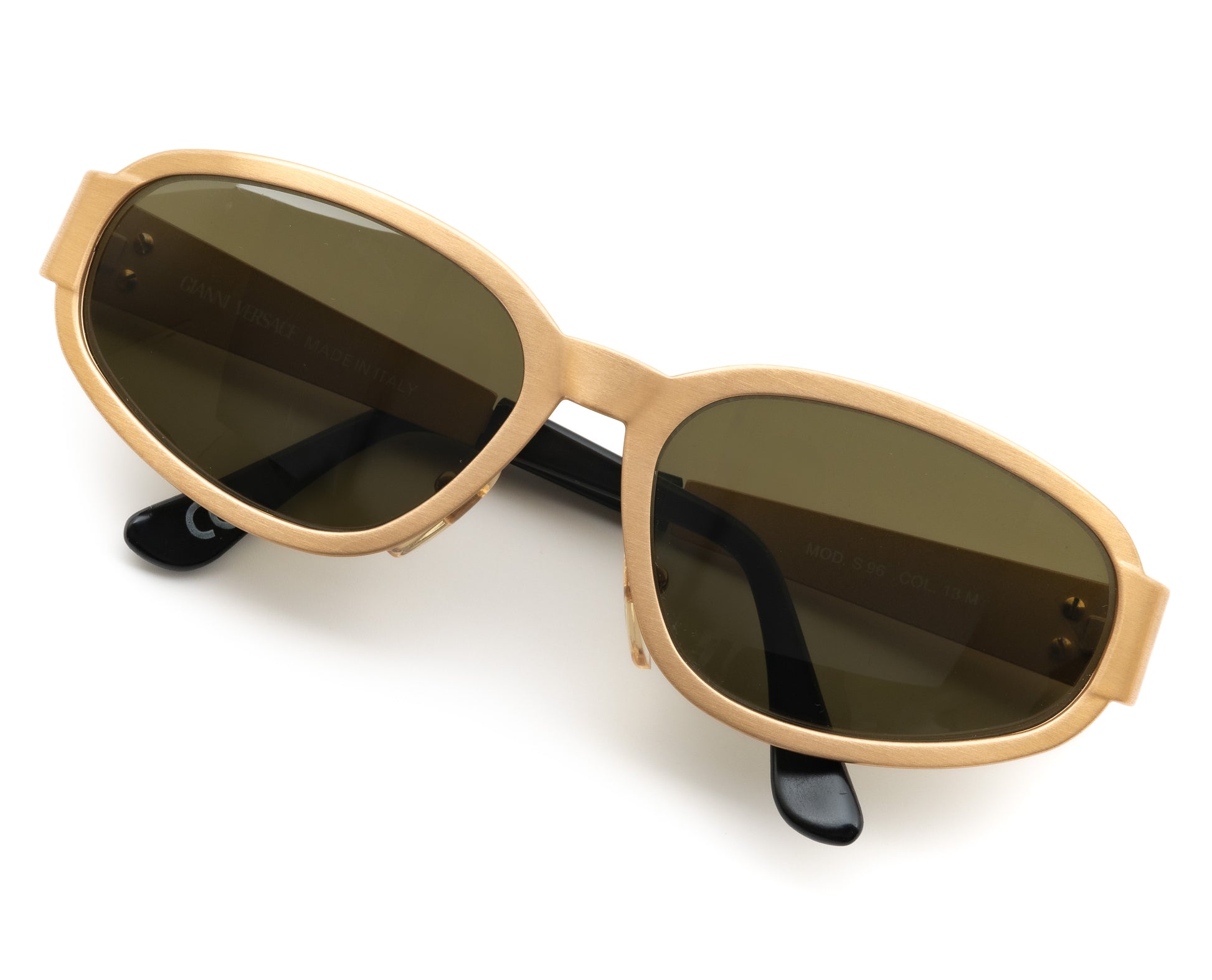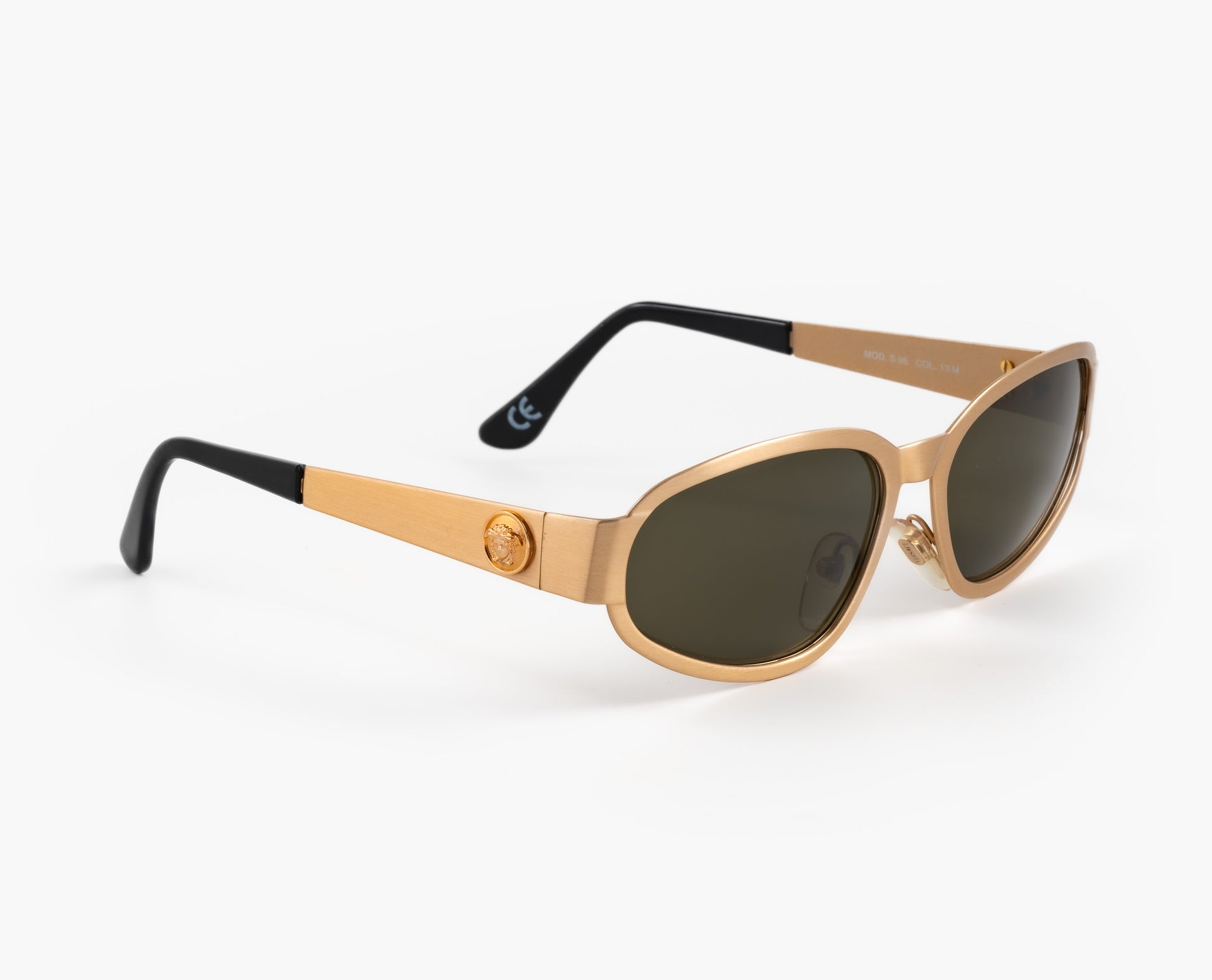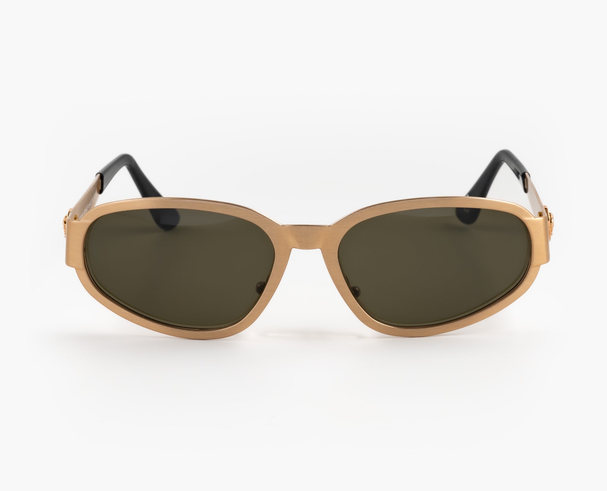 1990s Gianni Versace sunglasses. Brushed gold plated metal. Sporty cat eye look. Medusa heads on the side.