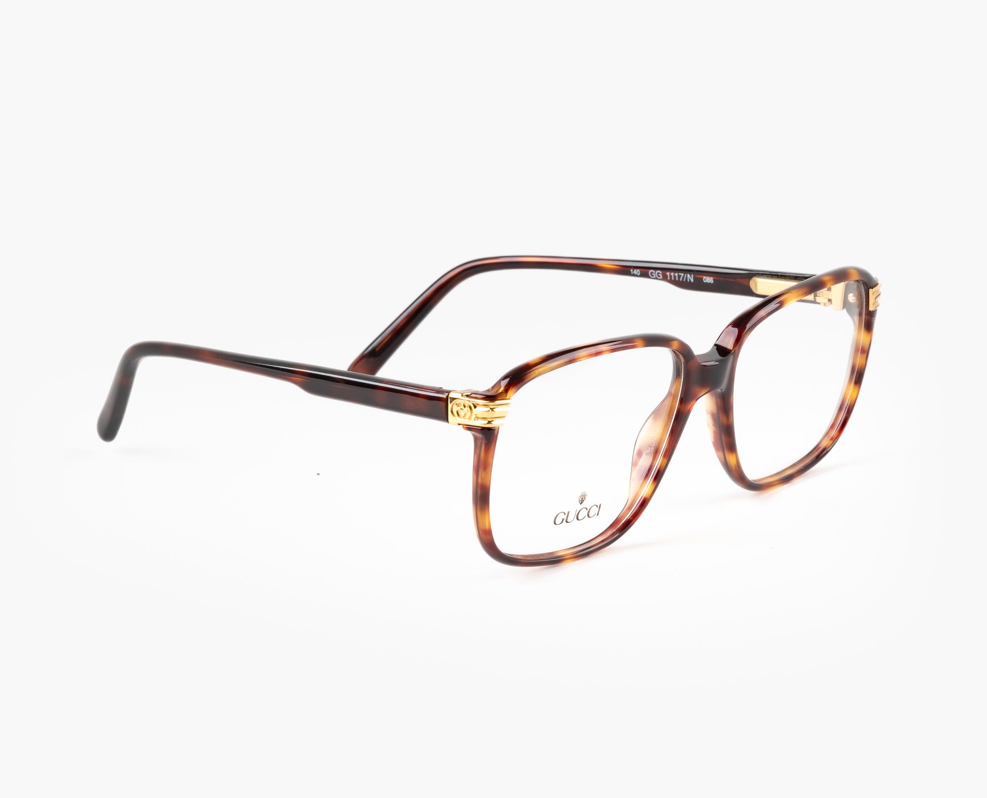 1980's Gucci square frames. Dark honey tortoise. Collectable to find them unused like this one.